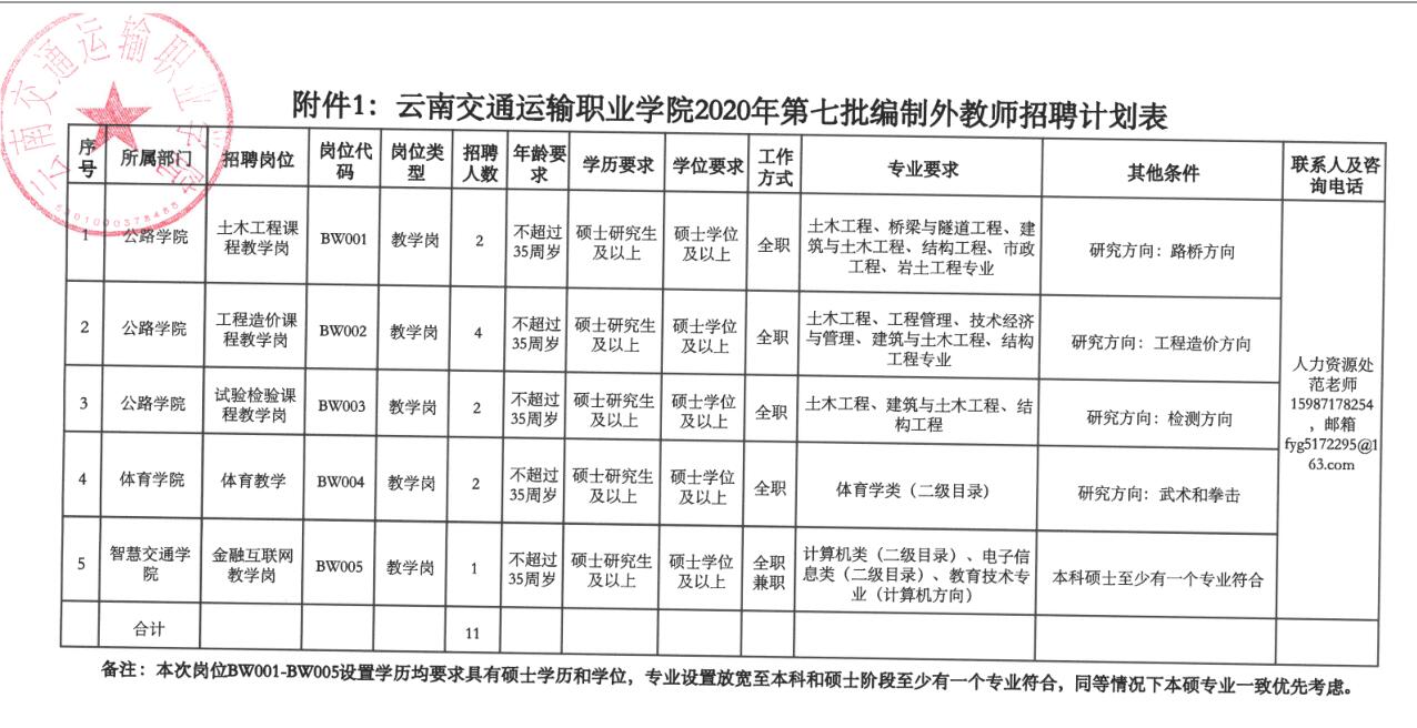 招聘崗位、專業(yè)及相關(guān)要求詳見(jiàn)《云南交通運(yùn)輸職業(yè)學(xué)院2020年編制外教師招聘計(jì)劃表》(附件1)和2020年云南省公務(wù)員考試專業(yè)目錄(附件3)。報(bào)名時(shí)間:2020年10月12日8:00至10月17日18:00。