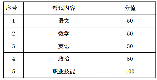 文化素質(zhì)測試為合格性測試,滿分200分,主要考查考生是否具備高中階段同等學(xué)習(xí)能力,考試科目為語文、數(shù)學(xué)、英語、政治;職業(yè)技能測試(職業(yè)適應(yīng)性測試),滿分100分。主要考查考生從事生產(chǎn)、建設(shè)、服務(wù)、管理等一線工作所必備的基本職業(yè)素質(zhì)或技能。
