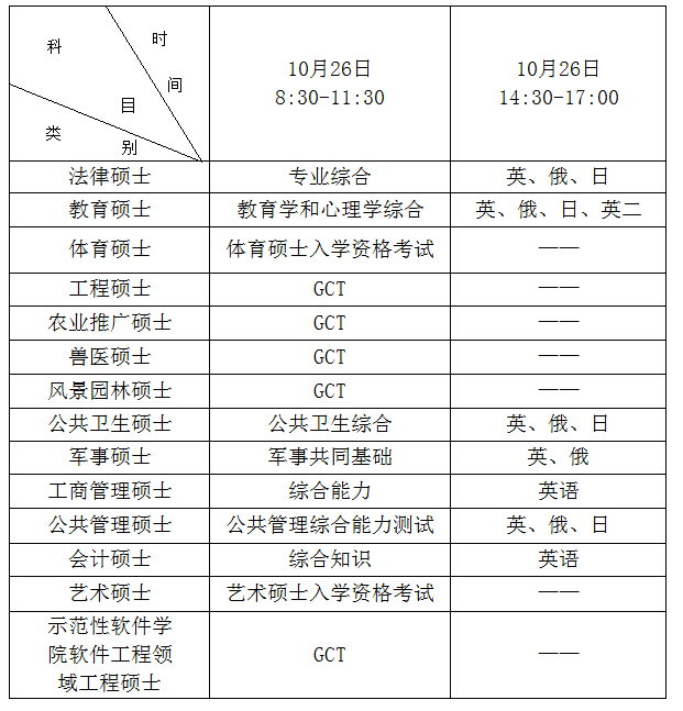 2014年在職人員攻讀碩士專業(yè)學(xué)位全國聯(lián)考考試時間為2014年10月26日,各專業(yè)學(xué)位類別考試科目及時間安排如下: