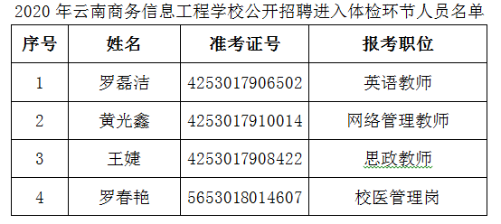 按照《云南商務(wù)信息工程學(xué)校2020年事業(yè)單位公開招聘工作人員公告》招聘程序,經(jīng)筆試、資格復(fù)審、面試后,根據(jù)綜合成績排名情況,按招聘人數(shù)與體檢人數(shù)1:1的比例確定參加體檢人員共4人。現(xiàn)將進(jìn)入體檢環(huán)節(jié)的人員名單及后續(xù)工作公告如下: