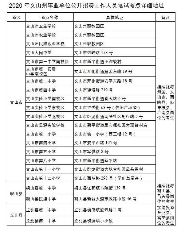 本次筆試文山州共設(shè)置3個考區(qū)、22個考點、1114個考場,其中:文山市考區(qū)設(shè)置18個考點、862個考場,接納報考州屬、文山市、西疇縣、麻栗坡縣、廣南縣崗位的考生;硯山縣考區(qū)設(shè)置2個考點、109個考場,接納報考硯山縣、馬關(guān)縣崗位的考生;丘北縣考區(qū)設(shè)置2個考點、143個考場,接納報考丘北縣、富寧縣崗位的考生。具體考點詳細(xì)地址附后。