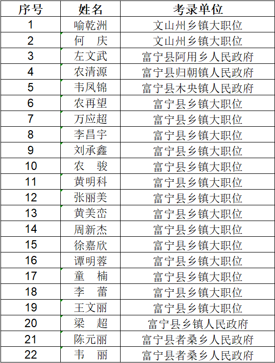2020年考試錄用公務(wù)員經(jīng)體檢合格由富寧縣負責(zé)考察的考生,具體人員名單及考察單位分配如下: