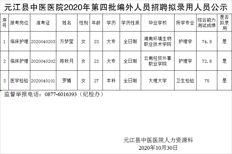元江縣中醫(yī)醫(yī)院2020年第四批編外人員招聘擬錄用人員公示