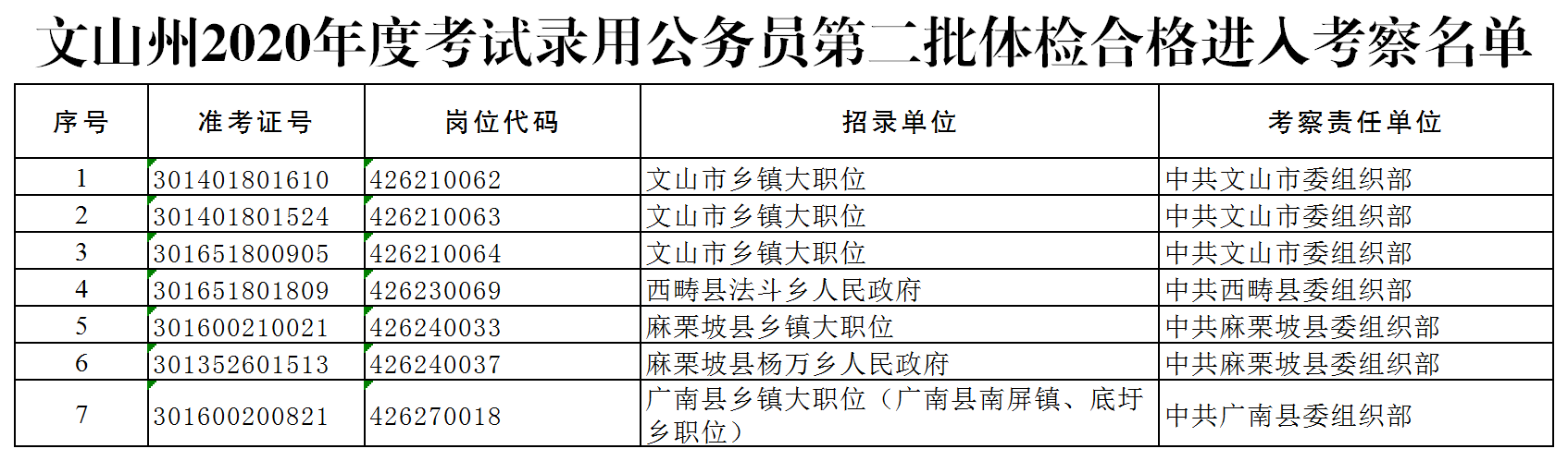 文山州2020年度考試錄用公務員第二批體檢合格進入考察名單