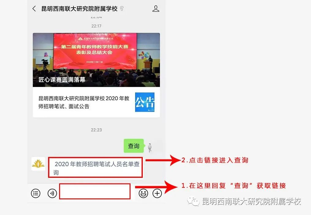 請應聘者掃描公告下方二維碼關注我校官方微信(官方微信平臺“西南聯(lián)大研究院附屬學校”ID:kmxlschool),在學校微信公眾平臺對話窗口頁面回復“查詢”獲取查詢鏈接,打開鏈接輸入身份證號碼和姓名可查詢是否進入筆試環(huán)節(jié),查詢時間:2020年11月12日至2020年11月14日。同時,入圍筆試者將會收到學校發(fā)送的手機短信(無需回復短信),敬請留意!