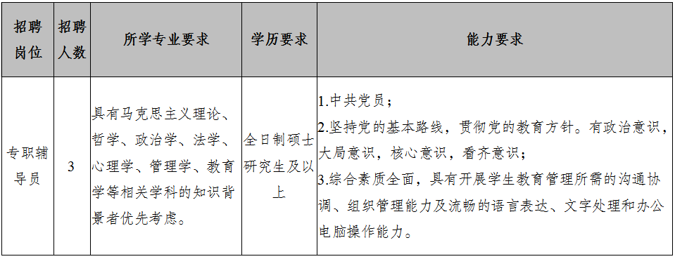 為適應(yīng)學(xué)校發(fā)展的需要,需面向社會誠聘3名專職輔導(dǎo)員,現(xiàn)將有關(guān)事項公告如下: