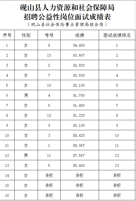 硯山縣人力資源和社會保障局招聘公益性崗位面試成績公示