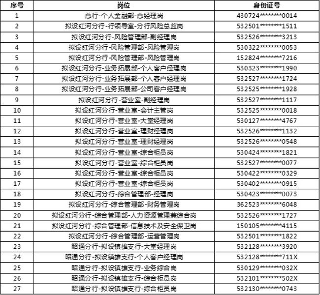 云南紅塔銀行2020年新設(shè)機構(gòu)及總行部分管理人員社會招聘考試已結(jié)束,現(xiàn)將入圍人員名單公告如下: