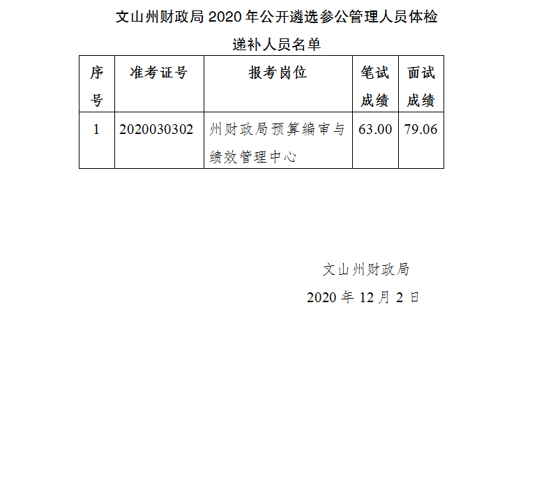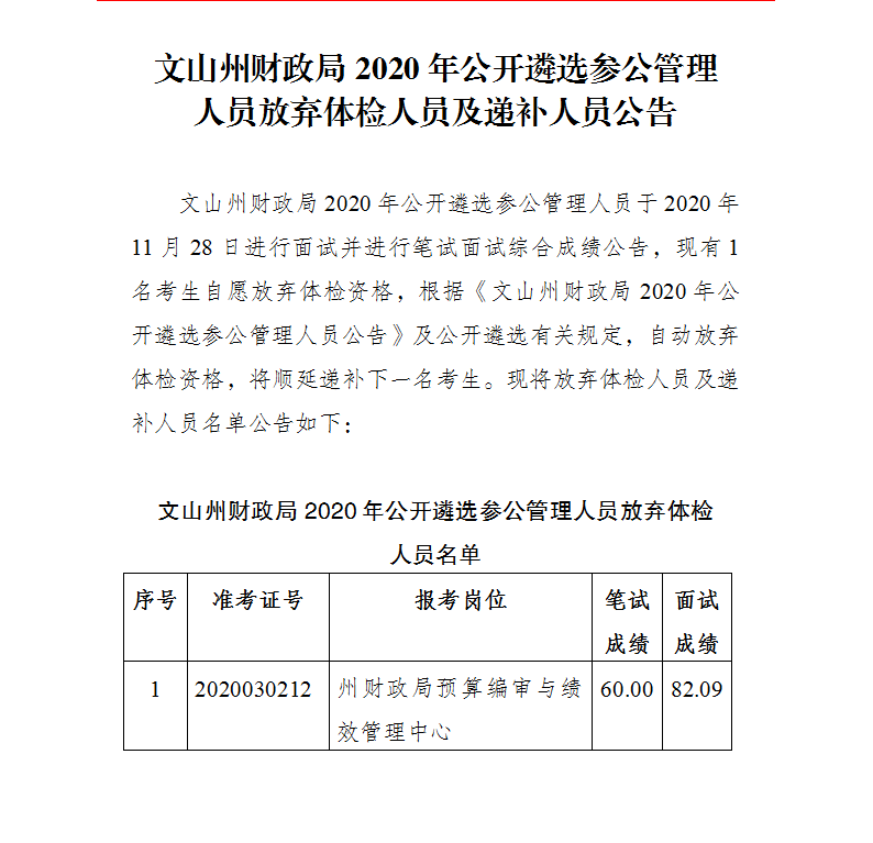 文山州財政局2020年公開遴選參公管理人員放棄體檢人員及遞補人員公告