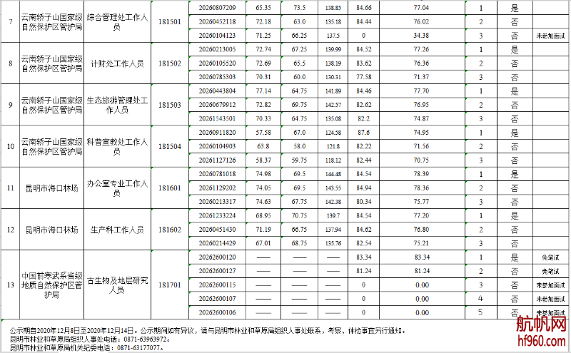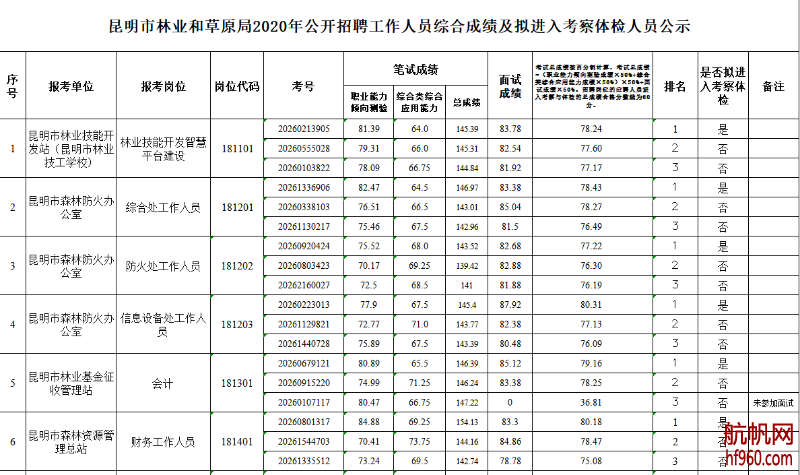 2020年昆明市林業(yè)和草原局招聘綜合成績及體檢人員公示