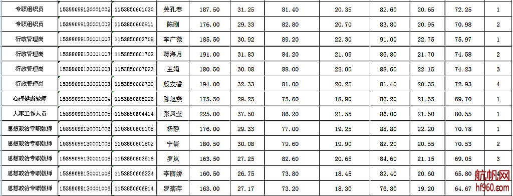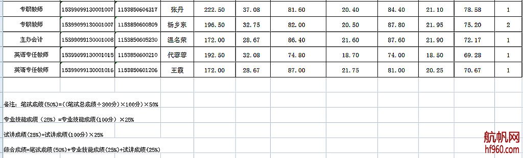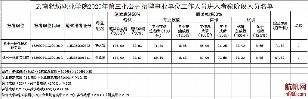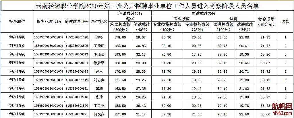 根據(jù)面試人員綜合成績(jī)(綜合成績(jī)=專業(yè)技能成績(jī)×50%+試講面試成績(jī)×50% 或 綜合成績(jī)=專業(yè)技能成績(jī)×25%+試講面試成績(jī)×25%+實(shí)作成績(jī)×50%),按從高到低順序及崗位擬招聘人數(shù)等額確定進(jìn)入考察階段的人員。現(xiàn)將情況說明及公示如下: