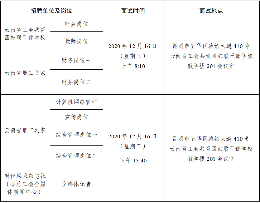 根據(jù)《云南省總工會(huì)直屬事業(yè)單位2020年公開招聘工作人員公告》規(guī)定,請(qǐng)通過資格復(fù)審的人員攜帶居民身份證和筆試準(zhǔn)考證,于2020年12月16日(星期三)前往昆明市五華區(qū)滇緬大道410號(hào)(云南省工會(huì)共青團(tuán)婦聯(lián)干部學(xué)校)參加面試。