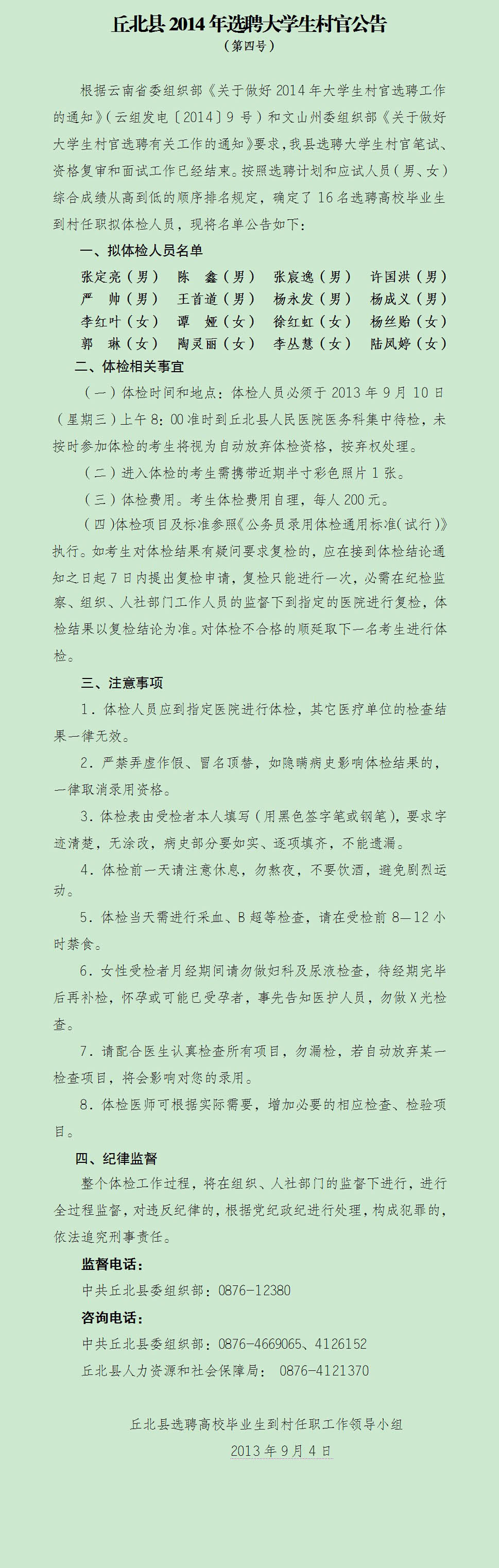 文山州丘北縣2014年選聘大學(xué)生村官公告(第四號(hào))