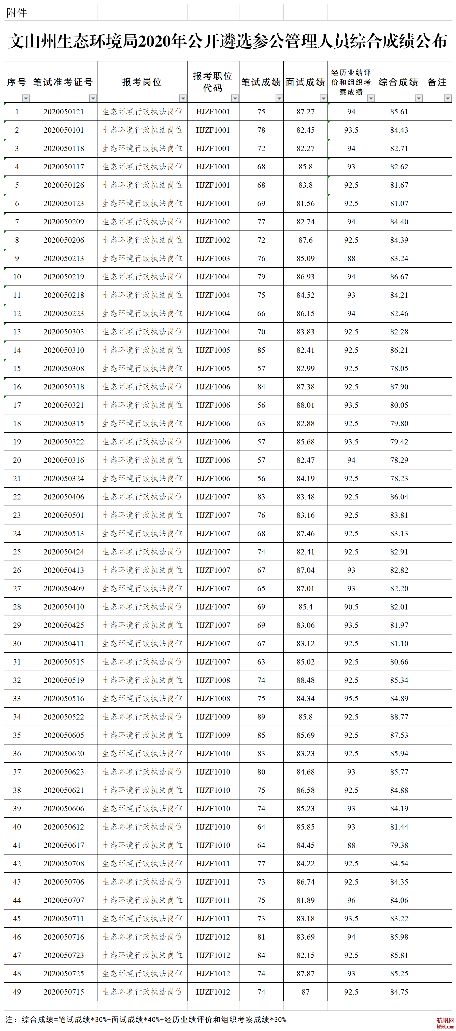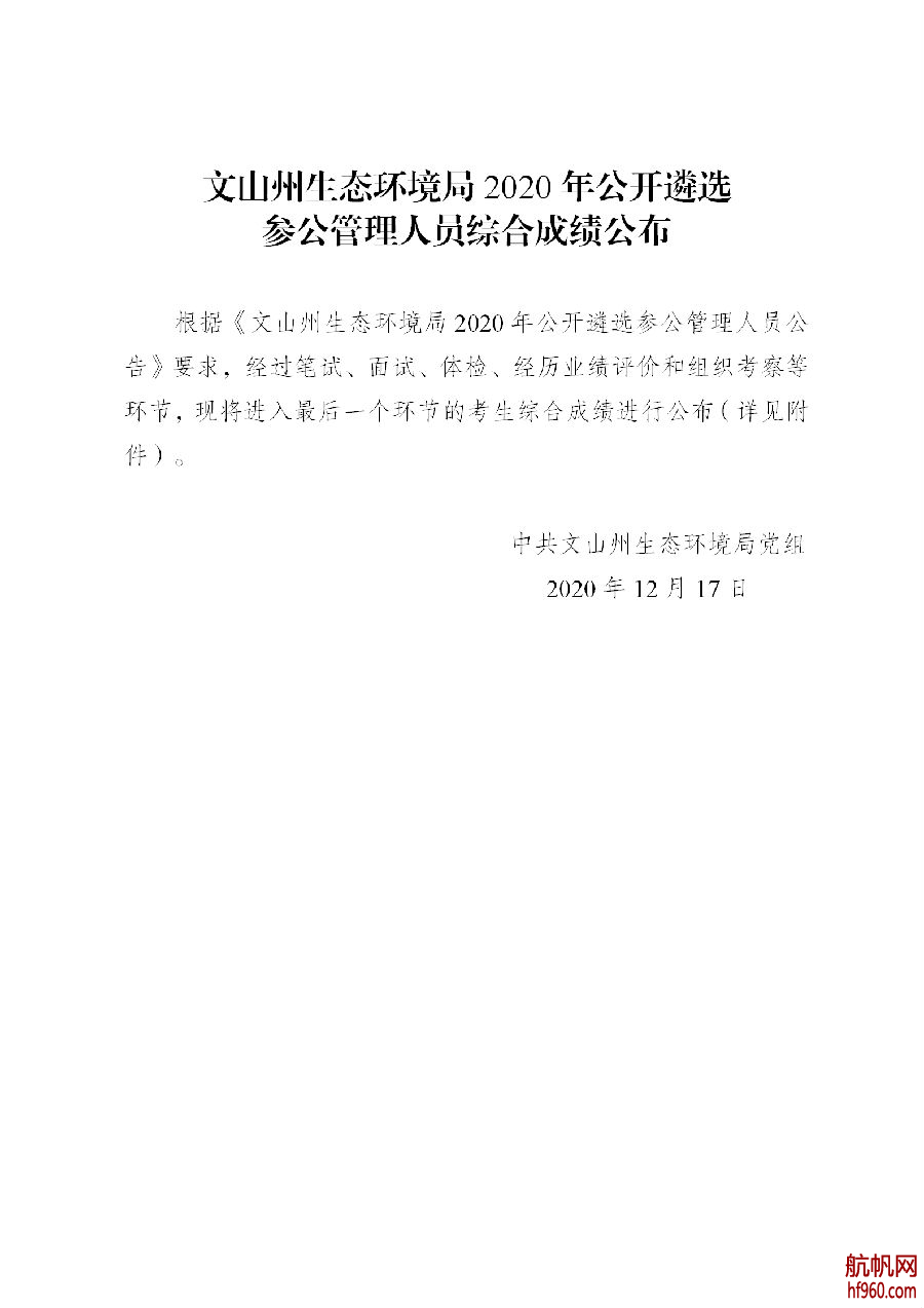 文山州生態(tài)環(huán)境局2020年公開遴選參公管理人員綜合成績公布