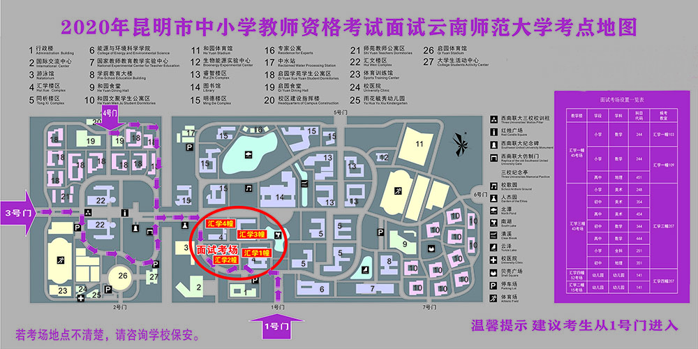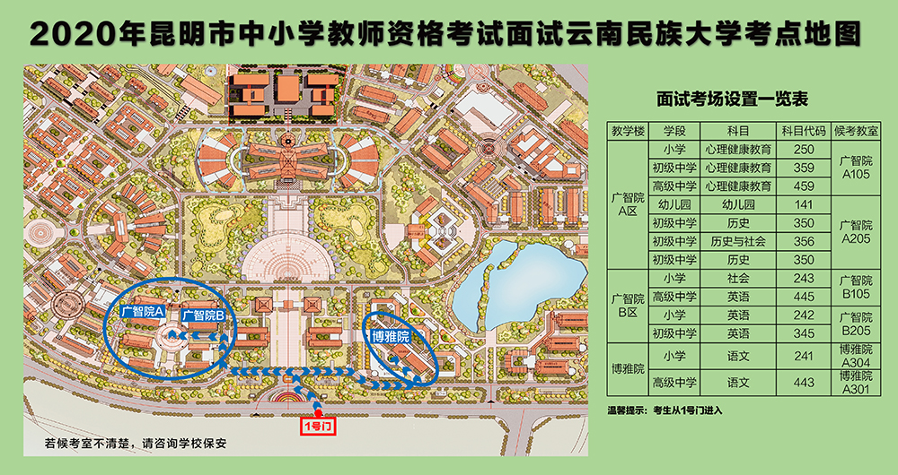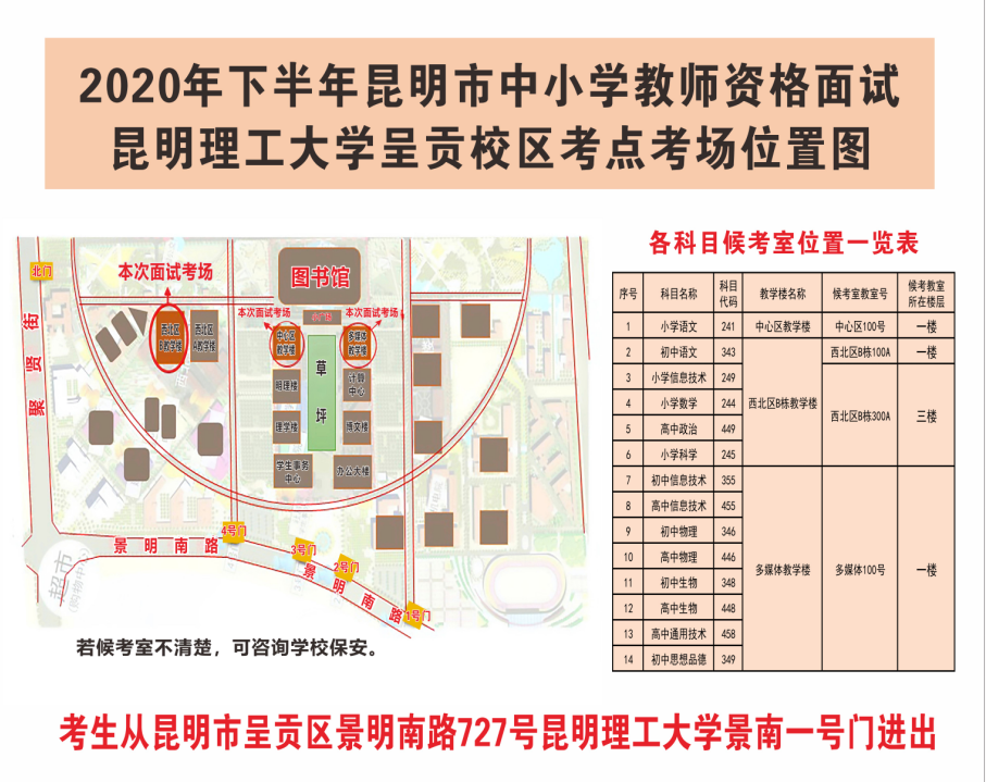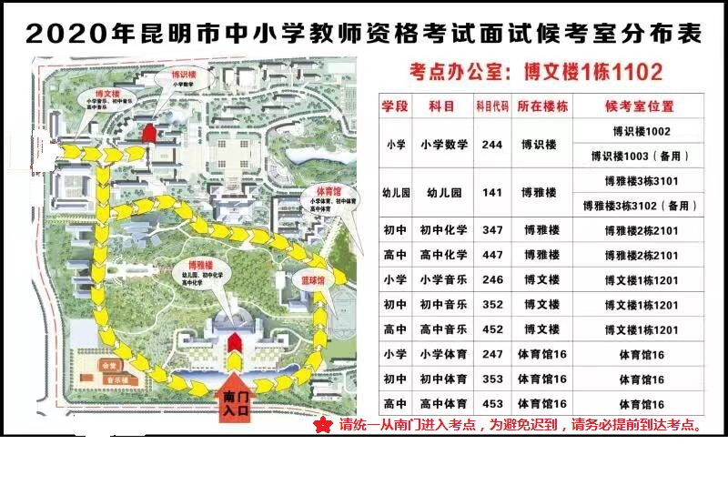 按照《云南省2020年下半年中小學教師資格考試(面試)公告》和《昆明市2020年下半年中小學教師資格考試(面試)疫情防控要求公告》,結合目前疫情防控新形勢要求,為廣大考生能順利參加面試,現將考點示意圖、候考室分布及疫情防控補充事項公告如下: