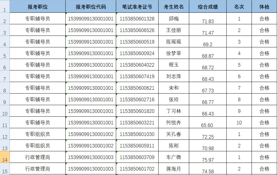 我校嚴格按照《事業(yè)單位公開招聘人員暫行規(guī)定》(中華人民共和國人事部令第6號)《云南省事業(yè)單位公開招聘工作人員辦法》(云人社發(fā)〔2016〕182號)及《云南省事業(yè)單位公開招聘工作人員面試測評暫行辦法》(云人社發(fā)〔2016〕405號)有關文件規(guī)定及《云南輕紡職業(yè)學院2020年第三批公開招聘事業(yè)單位工作人員公告》細則,于2020年10月24日全省統(tǒng)一筆試和12月5日學校面試兩個階段開展招聘工作,根據(jù)綜合成績排名經(jīng)體檢及考核考察階段,學校于2021年1月11日組織召開了云南輕紡職業(yè)學院第1次院長辦公會,確定擬聘用人員28人,現(xiàn)將擬聘用人員信息進行公示。