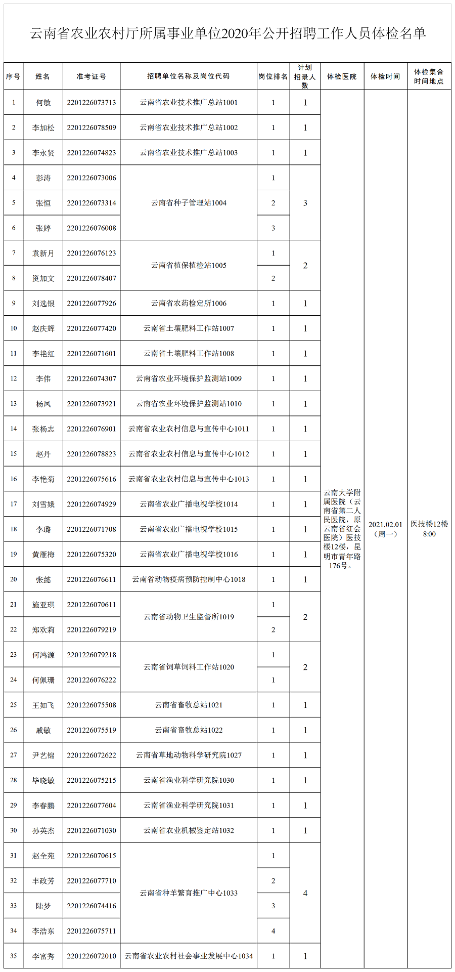 附件:1.云南省農(nóng)業(yè)農(nóng)村廳所屬事業(yè)單位2020年公開招聘工作人員體檢名單.xls