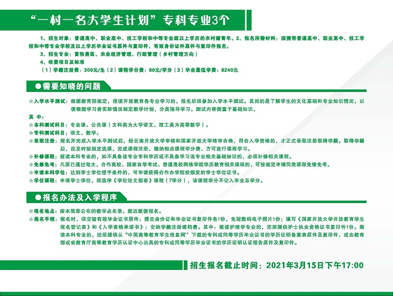 國家開放大學2021年春季開放教育招生簡章 來源:http://www.ynou.edu.cn/A10/A10015/2020_12/31/1609384513389437.html
