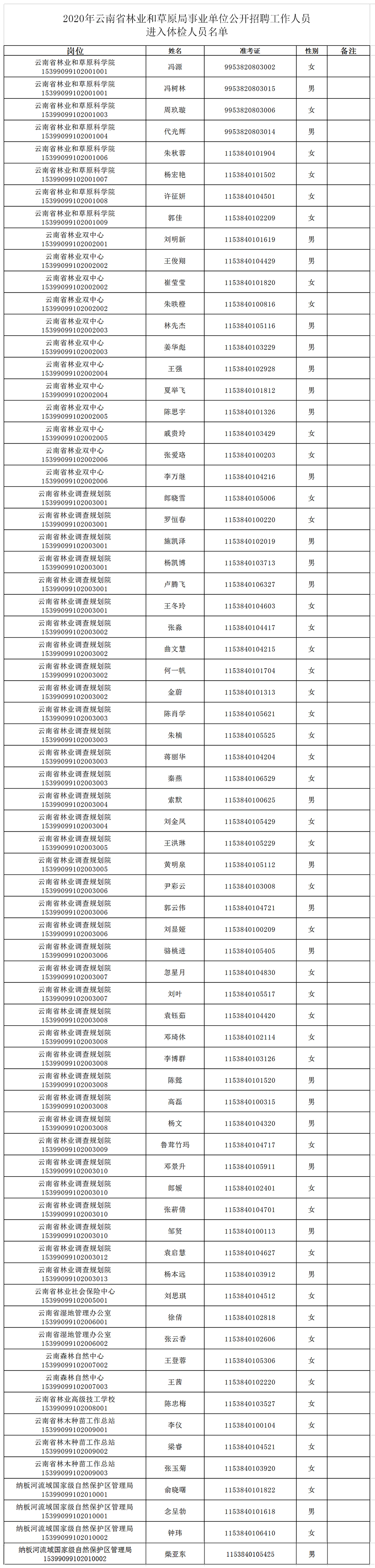 附件:云南省林業(yè)和草原局2020年事業(yè)單位公開招聘工作人員進(jìn)入體檢人員名單.xlsx