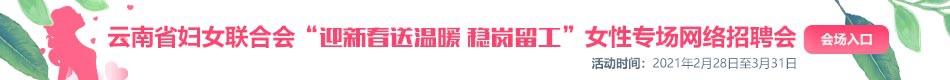 為貫徹落實黨中央、國務(wù)院和省委、省政府關(guān)于做好春節(jié)期間新冠肺炎疫情防控工作要求,鞏固來之不易的防控成果,按照《人力資源社會保障部、工業(yè)和信息化部、民政部、交通運輸部、國務(wù)院扶貧辦、全國總工會、全國婦聯(lián)關(guān)于開展“迎新春送溫暖、穩(wěn)崗留工”專項行動的通知》和《云南省就業(yè)工作領(lǐng)導(dǎo)小組辦公室關(guān)于認真做好“迎新春送溫暖、穩(wěn)崗留工”專項行動的通知》要求,降低疫情傳播風險,做好在滇過年務(wù)工人員服務(wù)保障,確保就業(yè)局勢總體穩(wěn)定,云南省婦女聯(lián)合會決定開展“云南省‘迎新春送溫暖、穩(wěn)崗留工’女性專場網(wǎng)絡(luò)招聘會”,誠邀您的參與。具體情況如下: