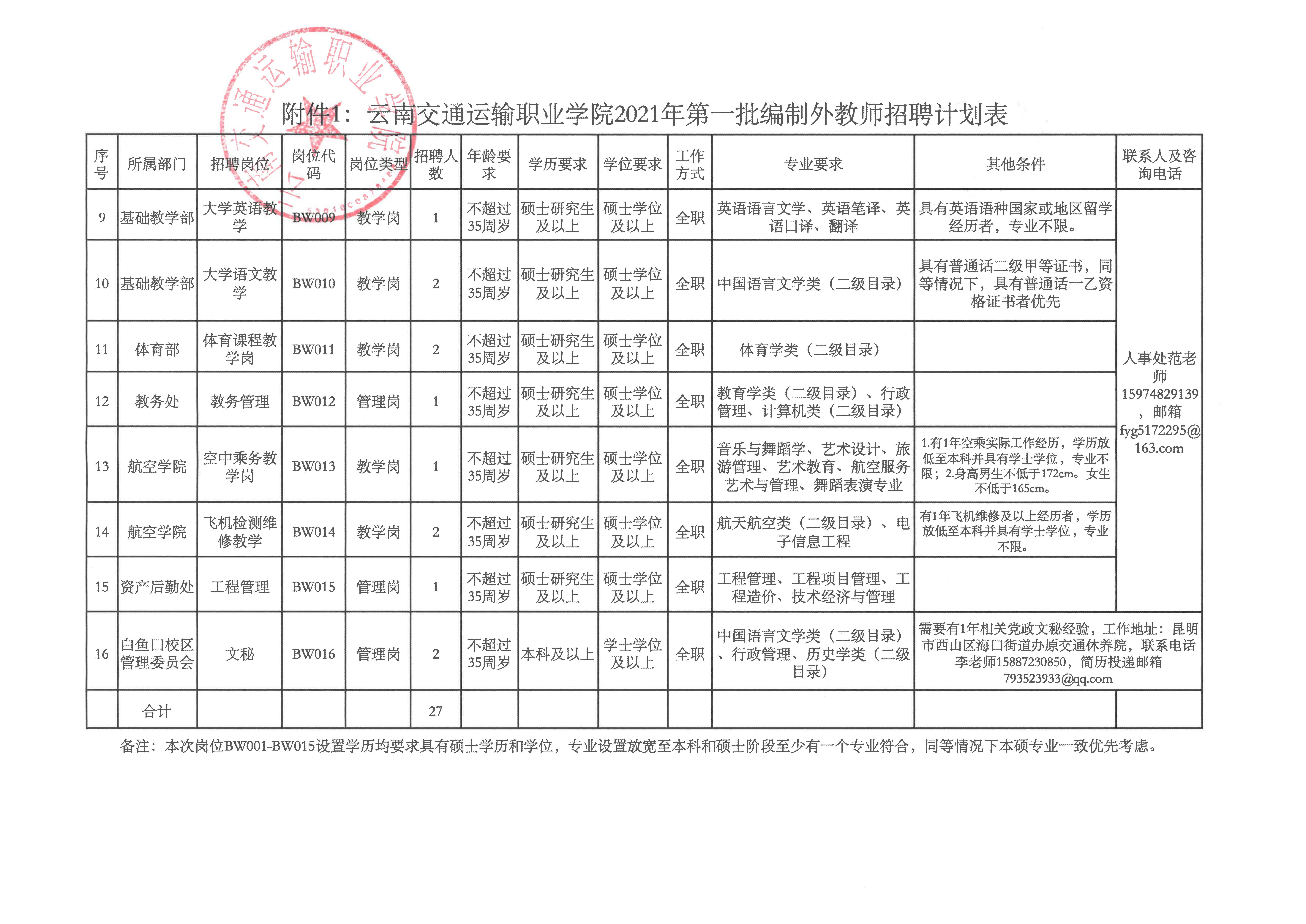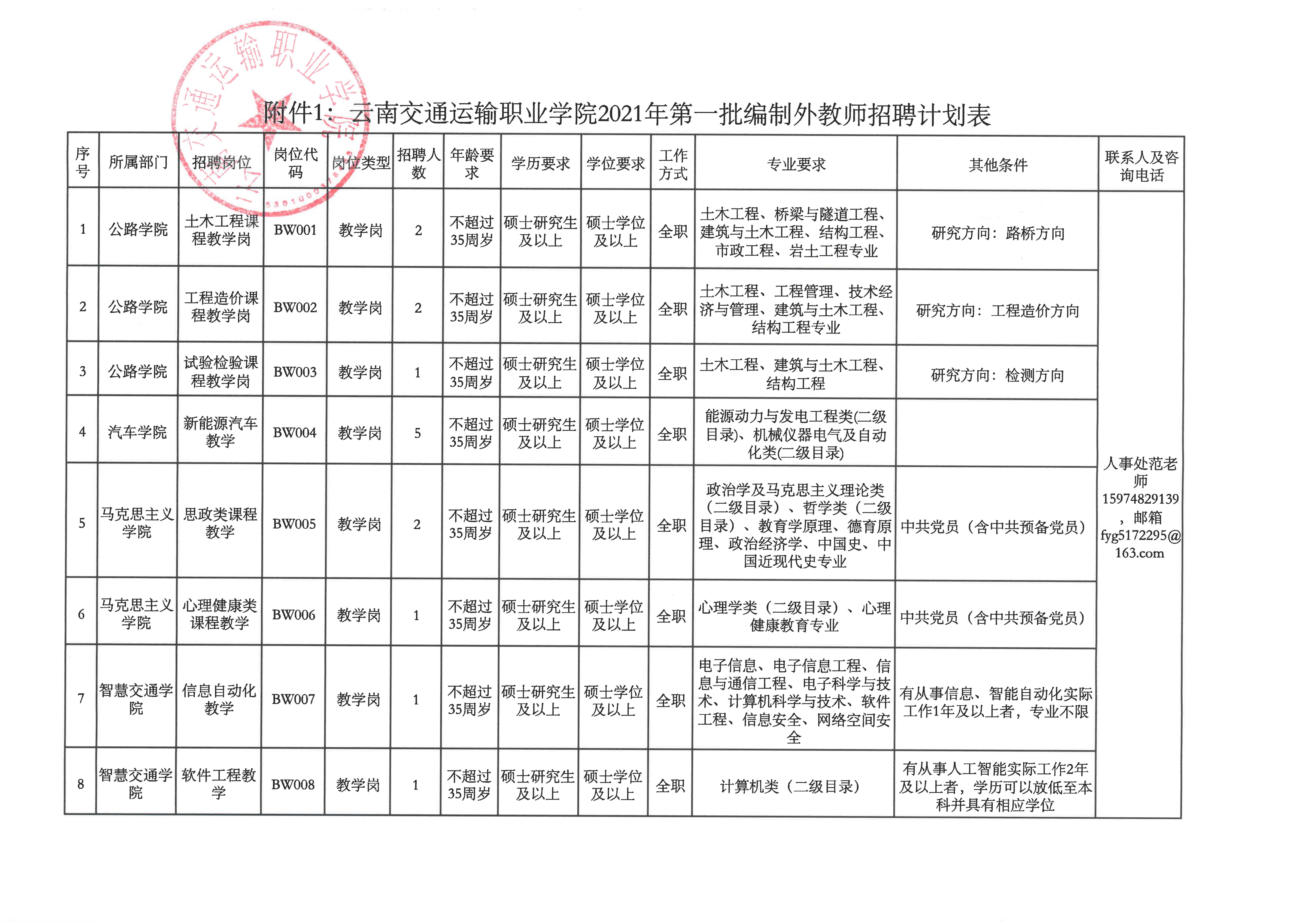 招聘崗位、專業(yè)及相關(guān)要求詳見《云南交通運(yùn)輸職業(yè)學(xué)院2021年第一批編制外教師招聘計(jì)劃表》(附件1)和2020年云南省公務(wù)員考試專業(yè)目錄(附件3)。報(bào)名時(shí)間:2021年2月25日8:00至3月3日18:00。