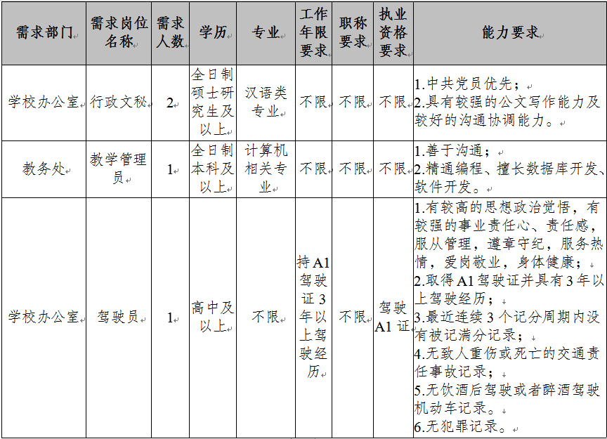 為適應(yīng)學(xué)校發(fā)展的需要,需面向社會誠聘4名工作人員,現(xiàn)將有關(guān)事項公告如下: