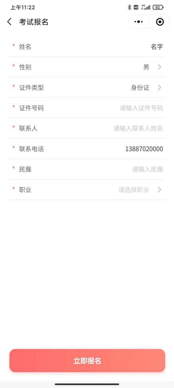 2、點(diǎn)擊“立即報(bào)名”,填入考生的相關(guān)信息(*號(hào)為必填項(xiàng),個(gè)人信息填報(bào)如有誤責(zé)任自負(fù))。