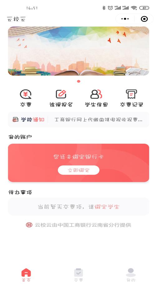 新用戶進(jìn)來可以看到云校云小程序的相關(guān)服務(wù)和功能,但如果要使用相應(yīng)功能的話需先進(jìn)行實(shí)名認(rèn)證和銀行卡綁定。首頁點(diǎn)擊“立即綁定”,彈出身份證上傳頁面,按要求提交證件照片。