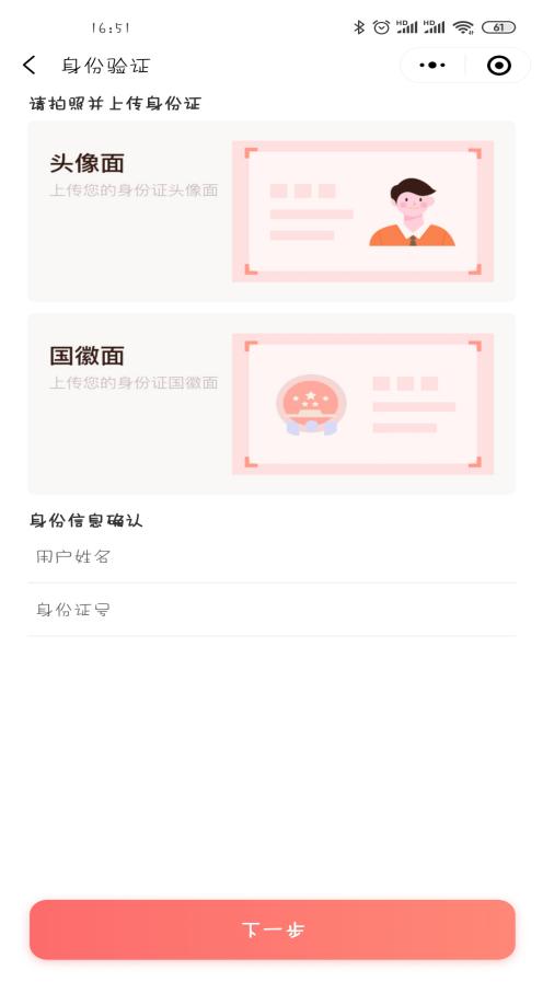 2 、身份證上傳成功后,自動(dòng)識(shí)別名字和身份證號(hào);點(diǎn)擊“下一步”,