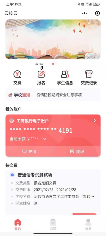 (微信--發(fā)現(xiàn)--小程序--搜索“云校云”---綁定銀行卡---填信息---繳費(fèi)---打印準(zhǔn)考證)
