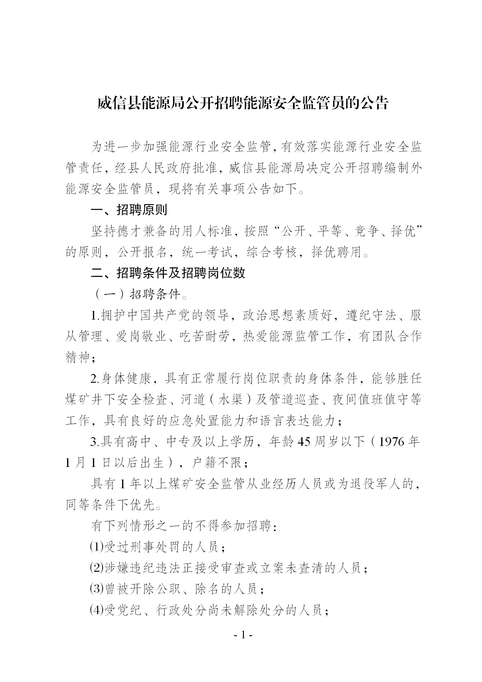 威信縣能源局公開(kāi)招聘能源安全監(jiān)管員的公告
