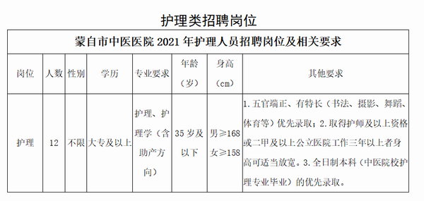 詳見《蒙自市中醫(yī)醫(yī)院2021年護(hù)理人員招聘崗位及相關(guān)要求表》。
