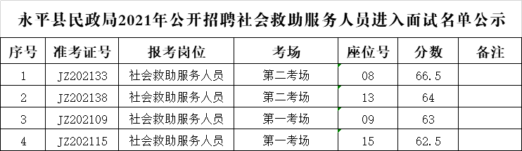 永平縣民政局2021年公開招聘社會救助服務(wù)人員進(jìn)入面試名單公示
