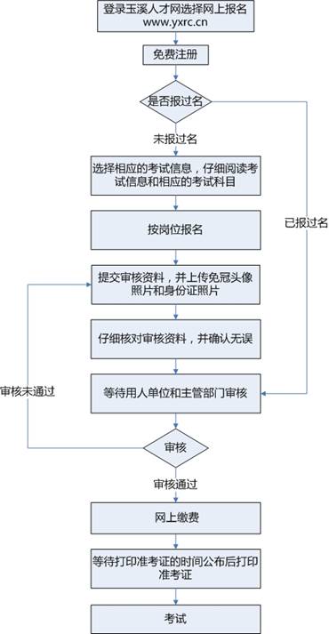 網(wǎng)絡(luò)報(bào)名的大致流程為:登錄玉溪人才網(wǎng)→網(wǎng)上報(bào)名入口→注冊(cè)→查看招聘崗位→按崗位報(bào)名并填寫(xiě)報(bào)名資料→等待審核→審核通過(guò)→網(wǎng)上交費(fèi)(注意查看交費(fèi)狀態(tài),確認(rèn)交費(fèi)成功)→打印筆試準(zhǔn)考證(打印時(shí)間在筆試公告內(nèi)另行通知)→參加筆試。