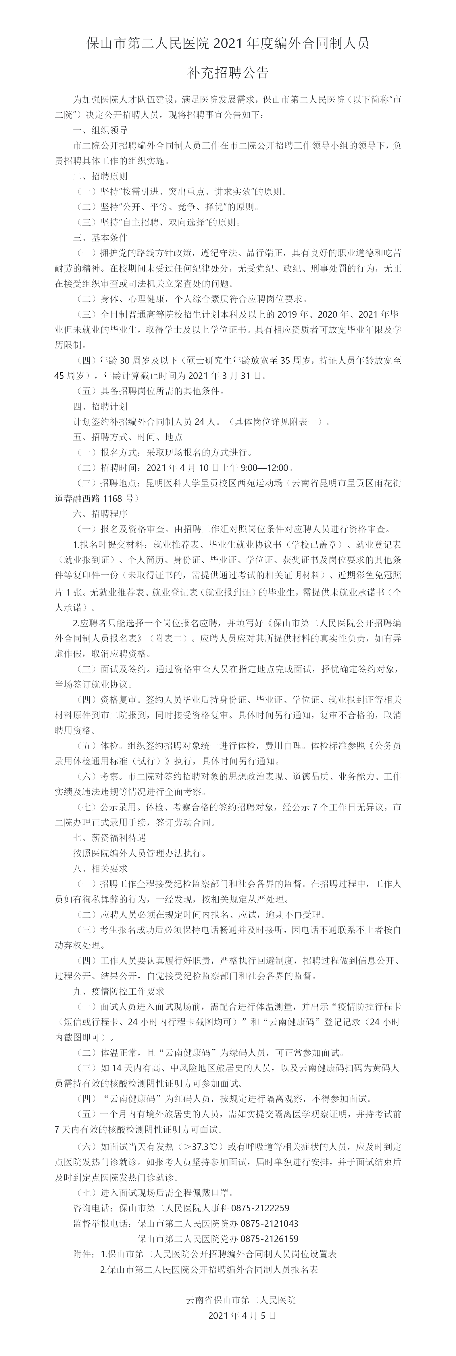 附件1:保山市第二人民醫(yī)院2021年補充招聘編外合同制人員崗位設置表(2021年4月5日)