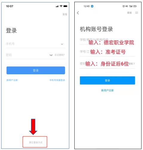 按照提示,第一欄輸入學(xué)校“德宏職業(yè)學(xué)院”,第二欄學(xué)號(hào)/工號(hào)處輸入“準(zhǔn)考證號(hào)”,第三欄初始登錄密碼為“身份證后六位”。