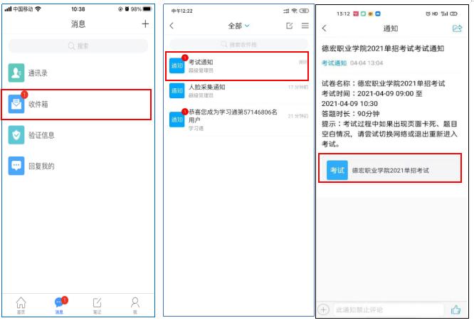 學(xué)校發(fā)起考試通知,點(diǎn)擊收件箱通知進(jìn)入考試。