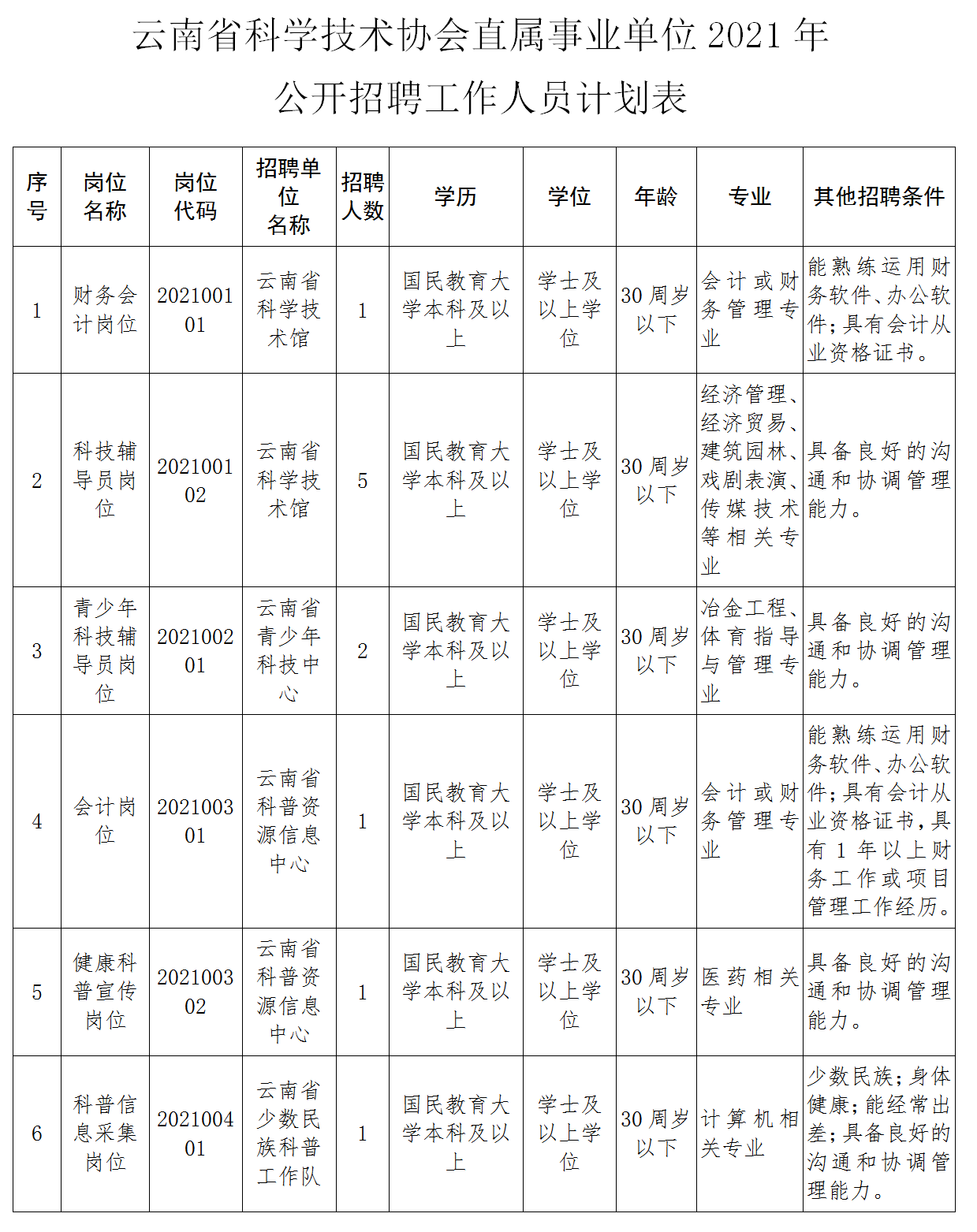 以上4家單位共招聘工作人員11名,具體招聘崗位及招聘條件,詳見《云南省科學(xué)技術(shù)協(xié)會直屬事業(yè)單位2021年公開招聘工作人員計劃表》(附件,以下簡稱《公開招聘計劃表》)。