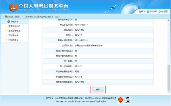 通過點擊“報名信息確認”按鈕后,跳轉到報名信息確認頁面,如下圖所示:
