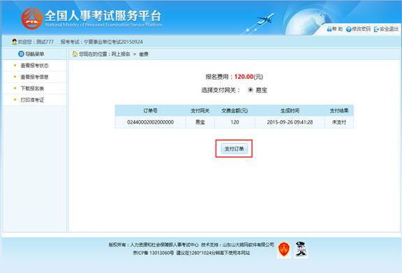 考生可以根據自己的情況選擇支付的網關,選擇完成后點擊“生成訂單”按鈕,