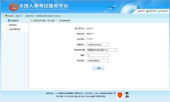 通過點擊系統(tǒng)導航菜單中“注冊信息維護”選項,可跳轉到修改注冊信息頁面,