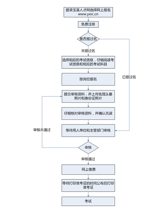 網(wǎng)絡(luò)報(bào)名的大致流程為:登錄玉溪人才網(wǎng)→網(wǎng)上報(bào)名入口→注冊(cè)→查看招聘崗位→按崗位報(bào)名并填寫(xiě)報(bào)名資料→等待審核→審核通過(guò)→網(wǎng)上交費(fèi)(注意查看交費(fèi)狀態(tài),確認(rèn)交費(fèi)成功)→打印筆試準(zhǔn)考證(打印時(shí)間在筆試公告內(nèi)另行通知)→參加筆試。