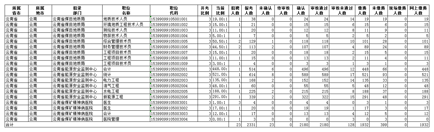 云南省 | 云南 | 云南省煤田地質局 | 測繪技術人員 | 15399099105001003 | 3 | 11.00:1 | 1 | 20 | 0 | 0 | 12 | 12 | 8 | 11 | 9 | 0 | 11 |