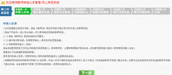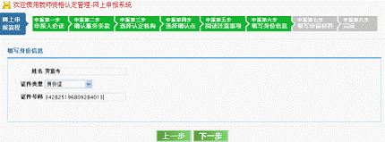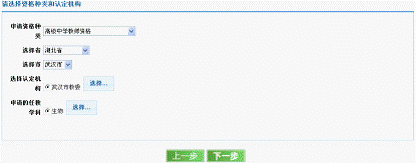 首先選擇資格種類,根據(jù)選定的資格種類控制認(rèn)定機構(gòu)下拉列表的顯示內(nèi)容。選擇省和選擇市作為篩選認(rèn)定機構(gòu)的條件,選擇了省或市后,點擊選擇認(rèn)定機構(gòu)后的“選擇”按鈕,則會顯示出所選省及市下所有能認(rèn)定申報的教師資格的認(rèn)定機構(gòu)。如果所選擇的認(rèn)定機構(gòu)沒有開通網(wǎng)報或者網(wǎng)報時間未到以及過了網(wǎng)報時間,則會給出提示,不能進行下一步,否則點擊下一步后進入申報第四步。