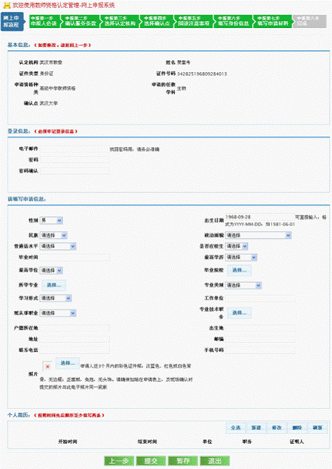 頁面的第三部分為申請人其他信息,申請人選擇“暫存”時,此部分信息可以根據(jù)實際填寫。“暫存”只是暫時保存申請人的申請信息,以備申請人在后面的時間登錄網(wǎng)上申報系統(tǒng)補充填寫完整,此條申請信息并未提交給認(rèn)定機構(gòu)。在申請人將全部申請信息填寫完成后,可以點擊“提交”按鈕,將個人申請信息提交給認(rèn)定機構(gòu)。