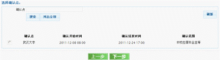 確認(rèn)點列表中會顯示所選認(rèn)定機構(gòu)網(wǎng)報時間段內(nèi)所有參與確認(rèn)工作的確認(rèn)點信息供申請人選擇。如果沒有選擇確認(rèn)點,點擊“下一步”時,會給出提示。