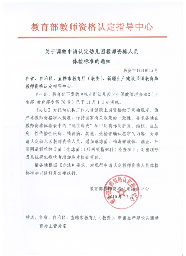 附件:1.關于調整申請認定幼兒園教師資格人員體檢標準的通知