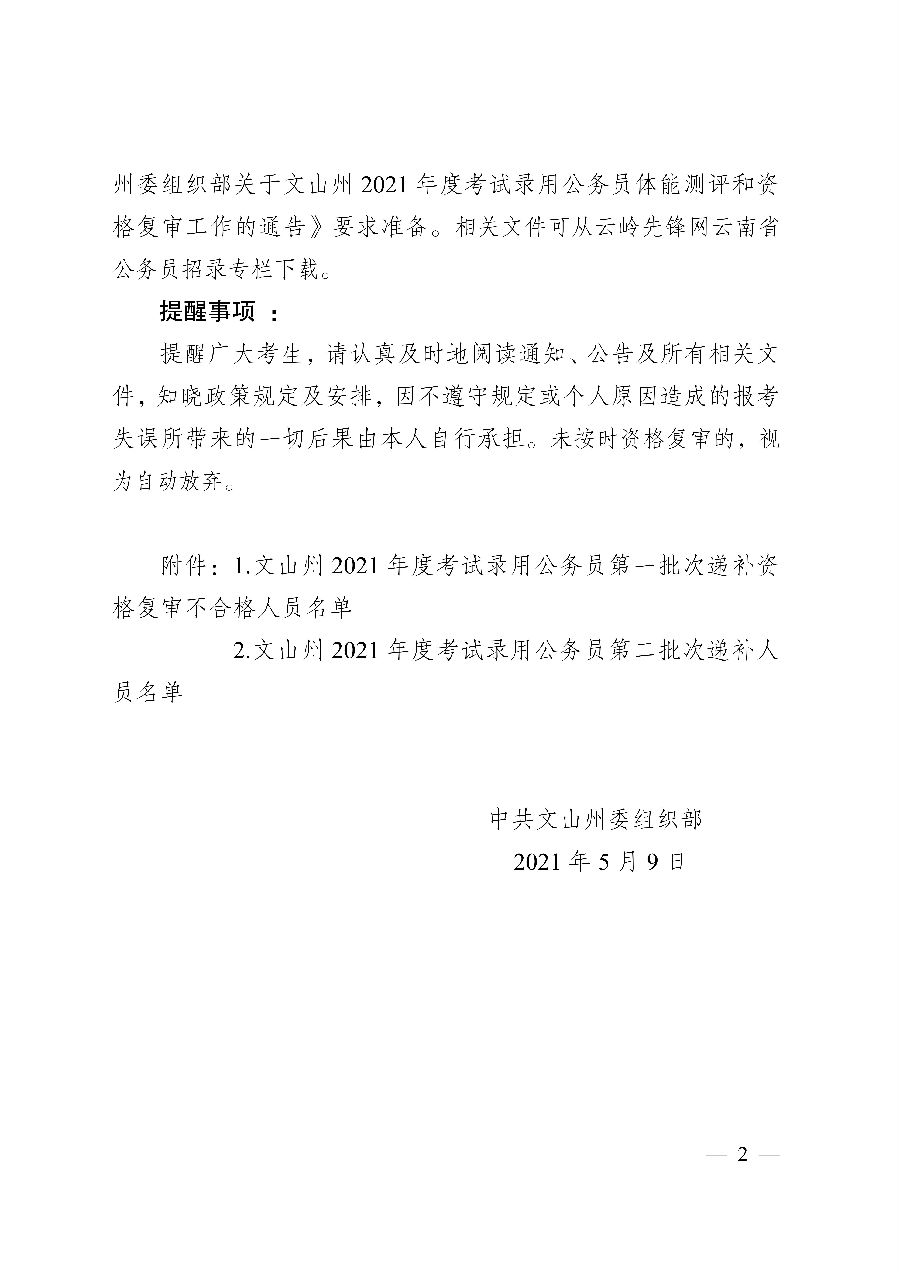 關(guān)于公布文山州2021年度考試錄用公務(wù)員第一批次遞補資格復(fù)審不合格人員名單和