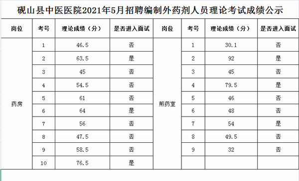 硯山縣中醫(yī)醫(yī)院2021年5月招聘編制外藥劑人員理論考試成績公示