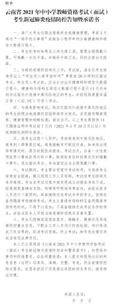 根據(jù)《云南省2021年上半年中小學教師資格考試(面試)新冠肺炎疫情防控工作指導意見》相關要求,為做好德宏考區(qū)2021年上半年中小學教師資格考試(面試)期間的疫情防控工作,保障廣大考生和考務人員面試期間的身體健康和生命安全,所有考生需按照《疫情防控工作考生須知》(附后)的疫情防控要求做好準備,提前下載打印并簽署紙質(zhì)《云南省2021年中小學教師資格考試(面試)考生新冠肺炎疫情防控告知暨承諾書》(見附件),進入考點時出示和提交后,方得參加考試。